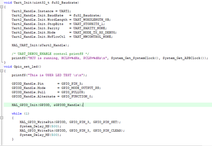 三、运行(目前芯片不支持下载后自启动,需要按下RESET键后,程序才能运行),以GPIO口翻转控制LED灯闪烁为例,部分示例代码(完整代码见附录)和现象如下: