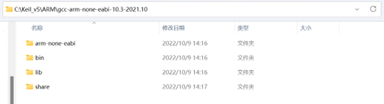 ②使用压缩包zip文件时,将文件放入C:\Keil_v5\ARM文件夹内解压,安装目录为C:\Keil_v5\ARM\gcc-arm-none-eabi-10.3-2021.10